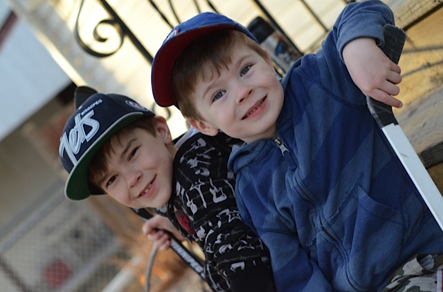 The cards and flowers aren't all that's all mixed up! I mentioned earlier that we have had some unusually warm and dry (there is NO snow left) but rainy weather! I'm still holding out hope for Ethan's party to be outdoors (for the first time ever)! On the weekend, it was + 20 something so while we were outside and the boys were playing hockey in the yard I snapped some photos! They obliged me and sat down for one together! Here they are being 'good buddies' as they called it and spent the majority of the weekend getting along determined to be continue to be good buddies…I hope that part sticks too!