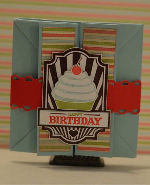 I had seen a few different versions of the Box Card shared lately and wanted to share this fun style of card with my stamp club members! All the the ones I had seen were created with DSP (patterned paper) and I knew that with having more club members than any one single pattern of DSP in my stash, I had to make it work with cardstock. I know…those of you who have seen my stash are probably skeptical that I didn't have more than enough DSP, but with 30 club members and even though I have many more packages than that of DSP, I still didn't have more than 30 sheets of any one particular color/pattern of DSP and I like for everyone to create the same project! It's just much simpler that way! So, I came up with this box card made out of cardstock and accented it with DSP. Enjoy!