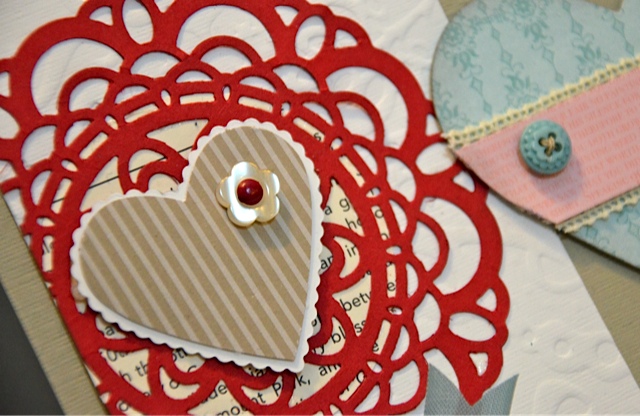 I'll share some of the details. Here I attached the button to the heart by putting the brad right through the holes in the button and then into the heart. It definitely won't fall off this way!