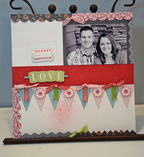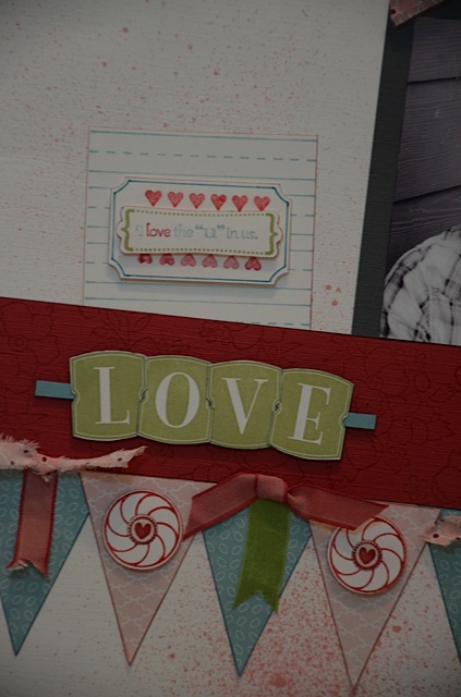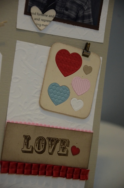 I loved how Carrie Gaskin had used the negative space of the embosslit, Fashionable Hearts to create a 'Quilt Square' so I knew i wanted to add one to this page. 6 passes through the big shot later, I'm happy with how it turned out and I had plenty of hearts left over to decorate this page. We also used an Early Espresso marker and the I Love Love wheel to stamp/roll love onto the tag.